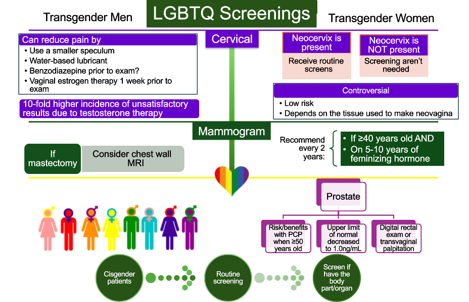 Lectures Screenings for LGBTQIA - Gretchen Shelesky, MD, MS, FAAPVideosPodcastsArticlesCancer.org - Cancer Care for Transgender and Gender Nonconforming People for Health Care ProfessionalsOptimizing gender-affirming medical care through anatomical inventories, clinical decision support, and population health management in electronic health record systemsReferences